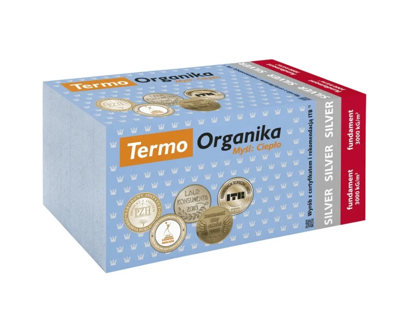 Termo Organika Silver Fundament. Lambda 0,036. Płyty o wymiarach 500x1000 mm. Grubość płyt 1-30 cm (frez 5-30 cm). Jeśli dana opcja nie jest dostępna w polu wyboru, wymagany jest kontakt ze sprzedawcą – wynika to z innej objętości paczki.